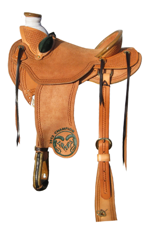 SPECIFICATIONS: Natural Herman Oak skriting leather and brown latigo. Natural rawhide horn, cantle and Oxbow stirrups. The tree is a "Ray Hunt" wade by Precision Saddle Trees. Rough out seat, fenders and skirts stamped with the southwest border seen throughout the saddle. Swell cover, cantle back and jockeys stamped with a geometric waffle pattern. 'Cam the Ram' logo and '2012 Champion' is hand carved and finshed off in CSU Green on the lower fender. Also included matching bucking rolls, mohair cinch, flank cinch and choker style breast collar. Bork solid brass hardware was used throughout, including plates for the riggins and extra heavy flank cinch buckles. |